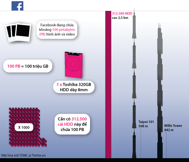Để có thể nhìn thấy sự khổng lồ của lượng dữ liệu trên, một biên tập viên của trang TechCrunch đã tạo nên hình Infographic dưới đây để đặt 100 PB dữ liệu vào các ổ cứng 320GB và so sánh tổng chiều cao của các ổ cứng này với chiều cao của các tòa nhà chọc trời trên thế giới, ta có: