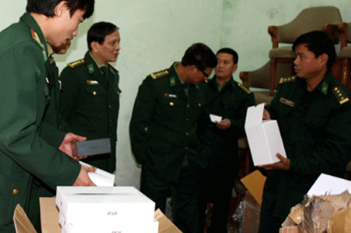 Kiểm tra, lực lượng biên phòng phát hiện lượng lớn hàng điện tử được cất giấu trong 25 bao tải màu đen gồm máy ảnh, điện thoại di động, iPad... không có giấy tờ. Số hàng lậu này trị giá hơn một tỉ đồng.