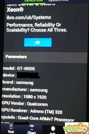 Vừa qua, điểm benchmark của Galaxy S IV tiếp tục lại bị rò rỉ. Thiết bị lần này có tên mã là GT-I9105 và sẽ dành cho thị trường Anh. Điểm số benchmark của sản phẩm cho thấy hiệu năng rất ấn tượng dù chỉ là trên lý thuyết. Ảnh benchmark rò rỉ của Galaxy S IV dành cho thị trường Anh.