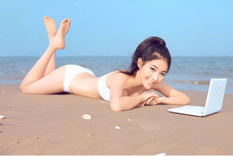 Cùng chiêm ngưỡng những hình ảnh của người mẫubikini ảnh khoe dáng cùng máy tính bên bờ biển.