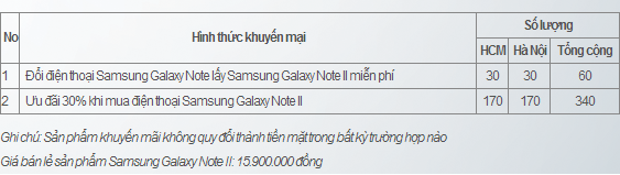- Tên chương trình: SAMSUNG GALAXY NOTE II - TRI ÂN SỰ TÍN NHIỆM - Thời gian thực hiện: Từ 9h-14h, ngày 07-10-2012 - Địa điểm: + 102-103 Vincom Center, 71 Lê Thánh Tôn, Q1, TP. Hồ Chí Minh. + Galaxy Note Studio Hà Nội, 191 Bà Triệu, Quận Hai Bà Trưng, Hà Nội. - Hình thức khuyến mại: